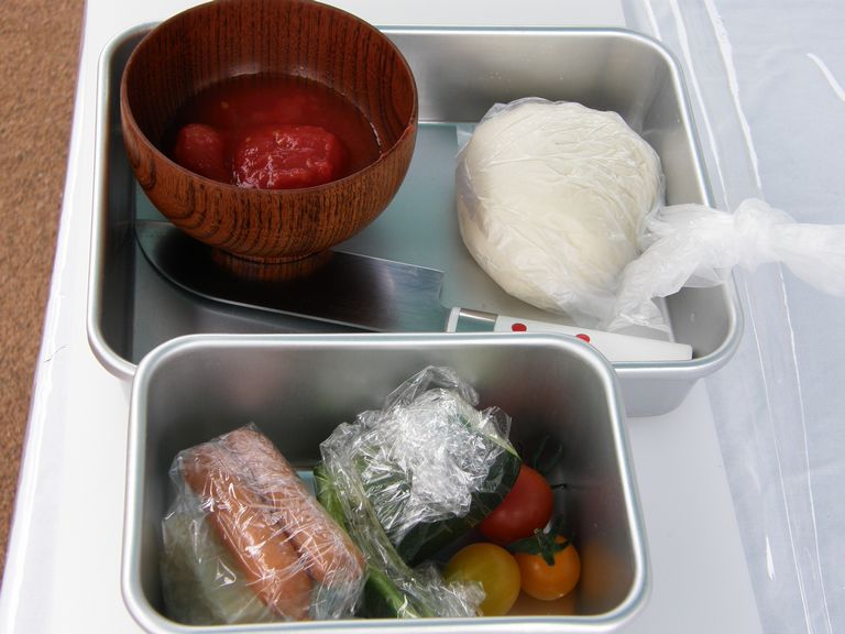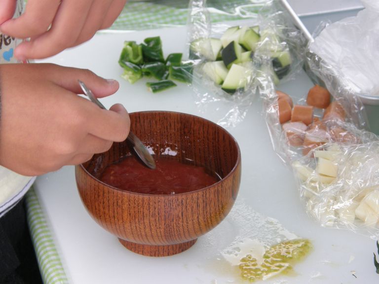 材料を切り、生地に塗るソースは、トマト・オリーブオイル・塩で混ぜ混ぜ・・