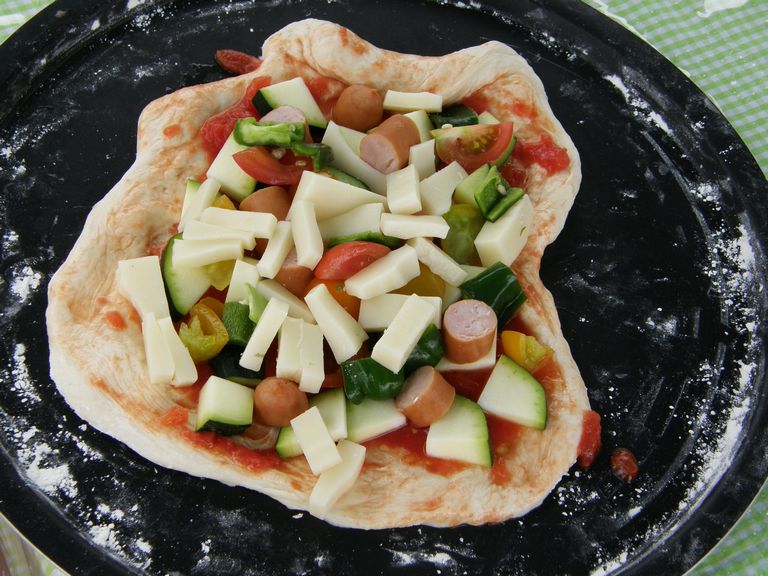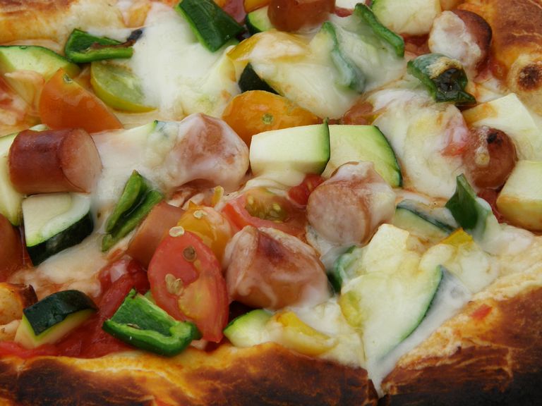 材料は、ソーセージ・ピーマン・ミニトマト・ズッキーニ・ピザ生地・ソース用トマト