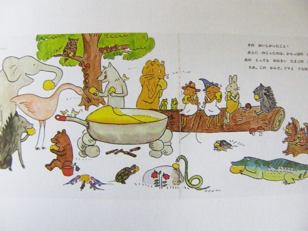 早速森の中におなべを運んできて、大きな卵で大きなカステラを焼くことにします。