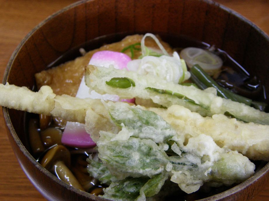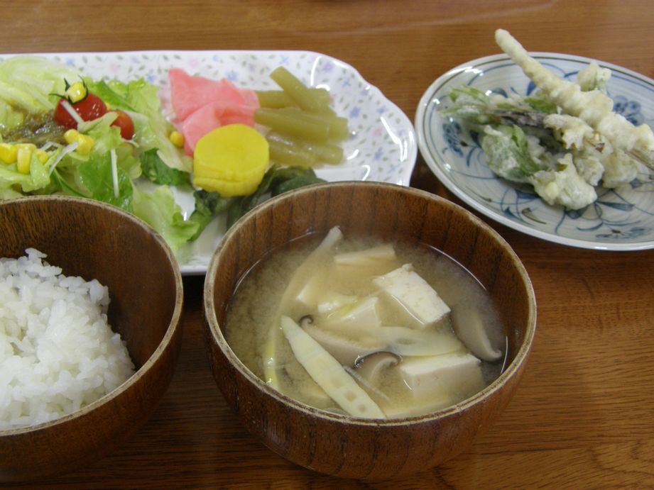 揚げたての山菜天ぷらに漬物にサラダにご飯に味噌汁にカレーにお蕎麦がありました。