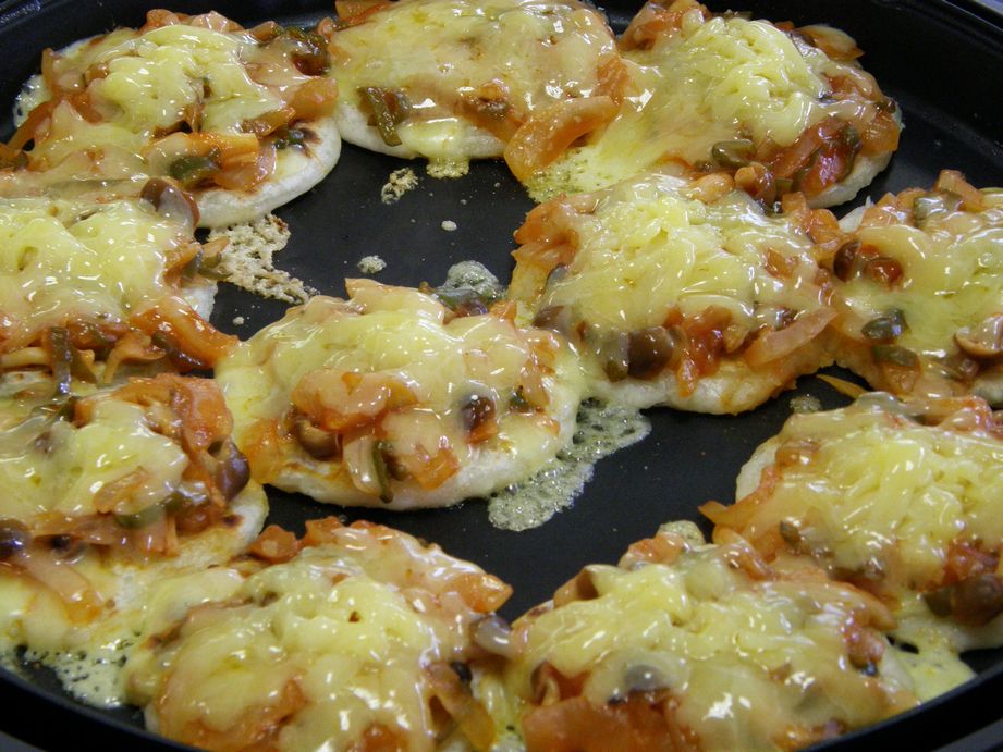 ホットプレート生地をのせ、両面ほど良い焦げ目を作ります。フライパンにサラダ油を少量いれ、玉ねぎとピーマンとしめじを炒め、ケチャップと塩コショウで味を調えます。炒め終ったら、